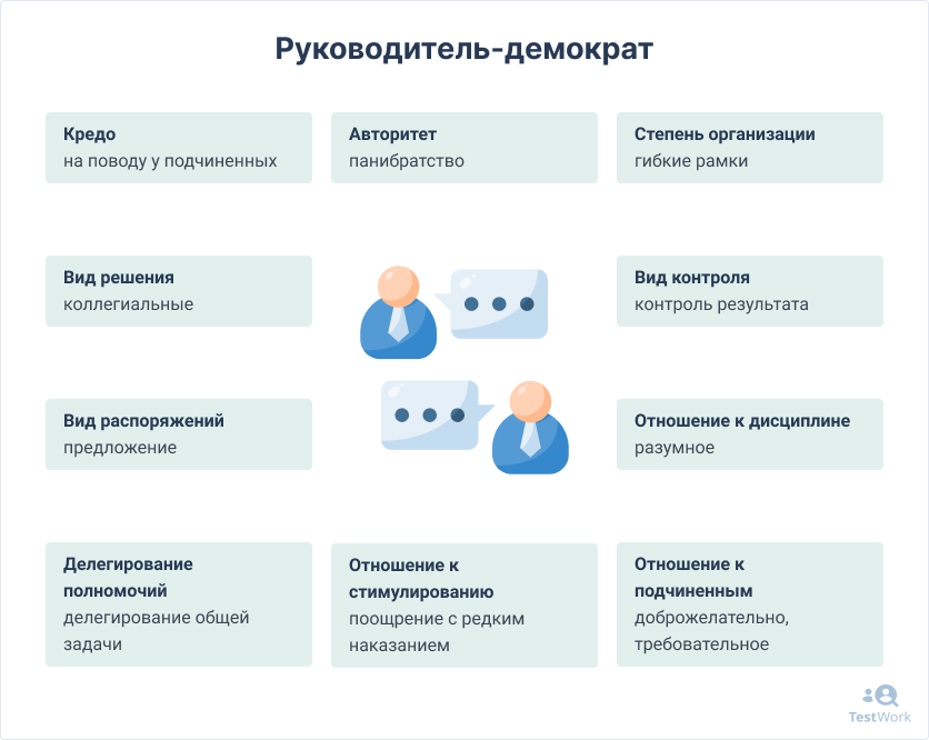 Руководитель в демократической компании выступает в роли профессионального лидера, товарища, одного из членов команды. Он нацелен на конечный результат и стремится принести компании максимальную выгоду. В коллективе с демократическим лидером всегда проводятся корпоративные праздники, приветствуется неформальное общение между коллегами.