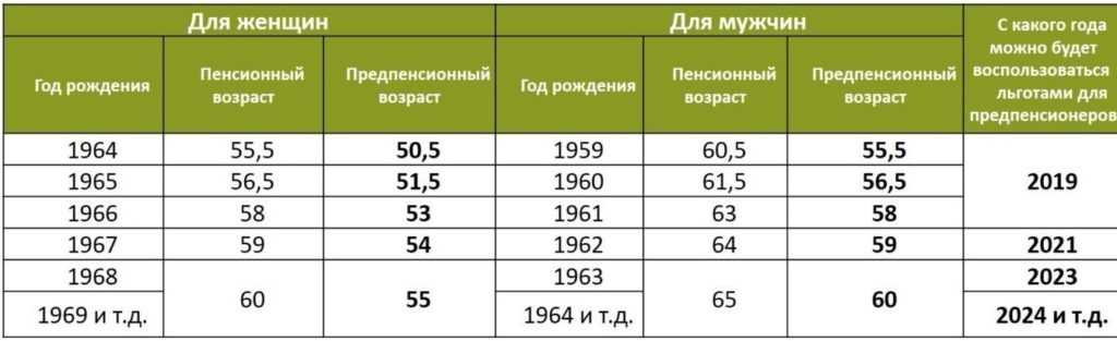 Сегодня актуален такой график получения статуса “предпенсионера” и льгот. По нему легко определить год, с которого можно начать получать предусмотренные для данного вида категорий льготы