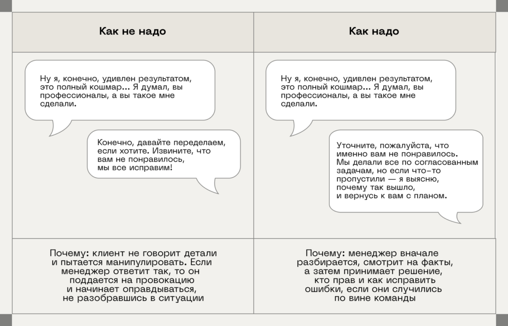 В этом случае вы имеете полное право отказаться от сотрудничества, аргументируя свое решение тем, что поведение клиента неприемлемо: «Простите, но наше сотрудничество не приводит к нужному результату. Я ценю ваше время и считаю правильным закончить работу сейчас, чем безрезультатно продолжать бесконечную переписку».