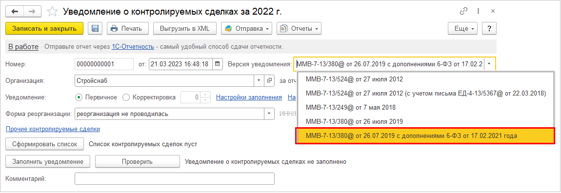 В документе Уведомление о контролируемых сделках доступна к выбору версия