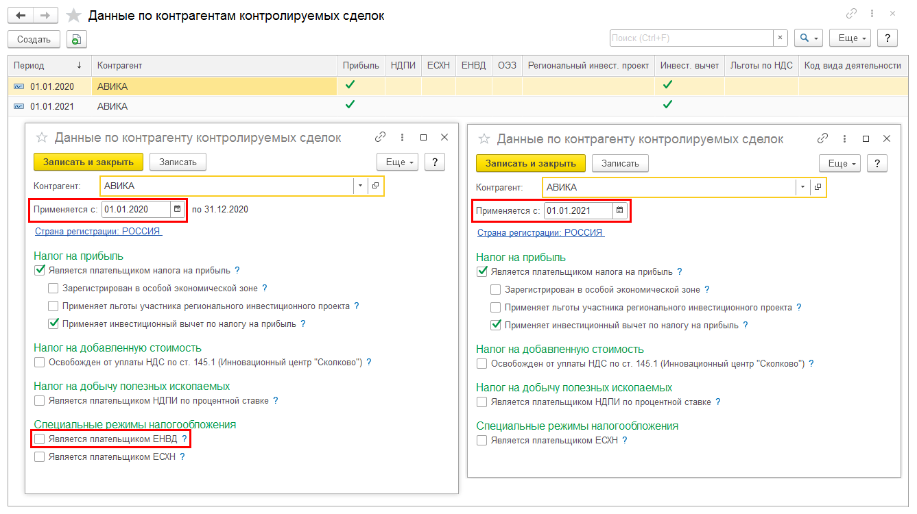 Из данных по контрагенту контролируемых сделок, действующих с 01.01.2021 и позже исключена настройка Является плательщиком ЕНВД.