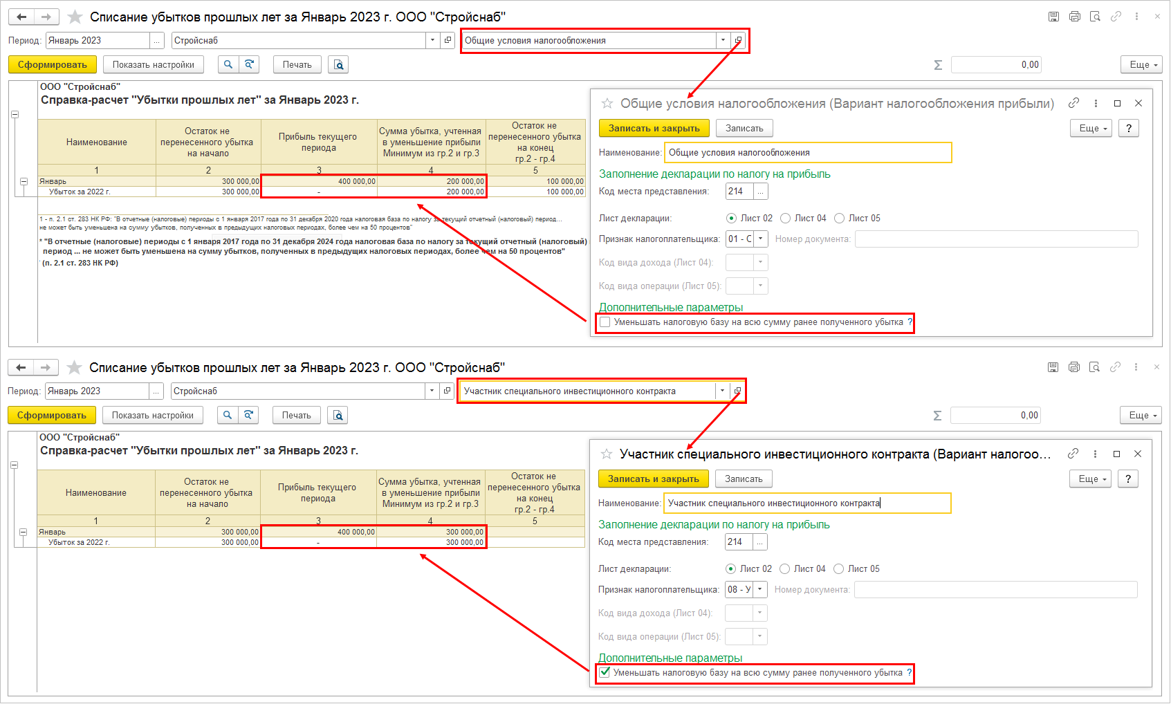 Если признак Уменьшать налоговую базу на всю сумму ранее полученного убытка в карточке элемента