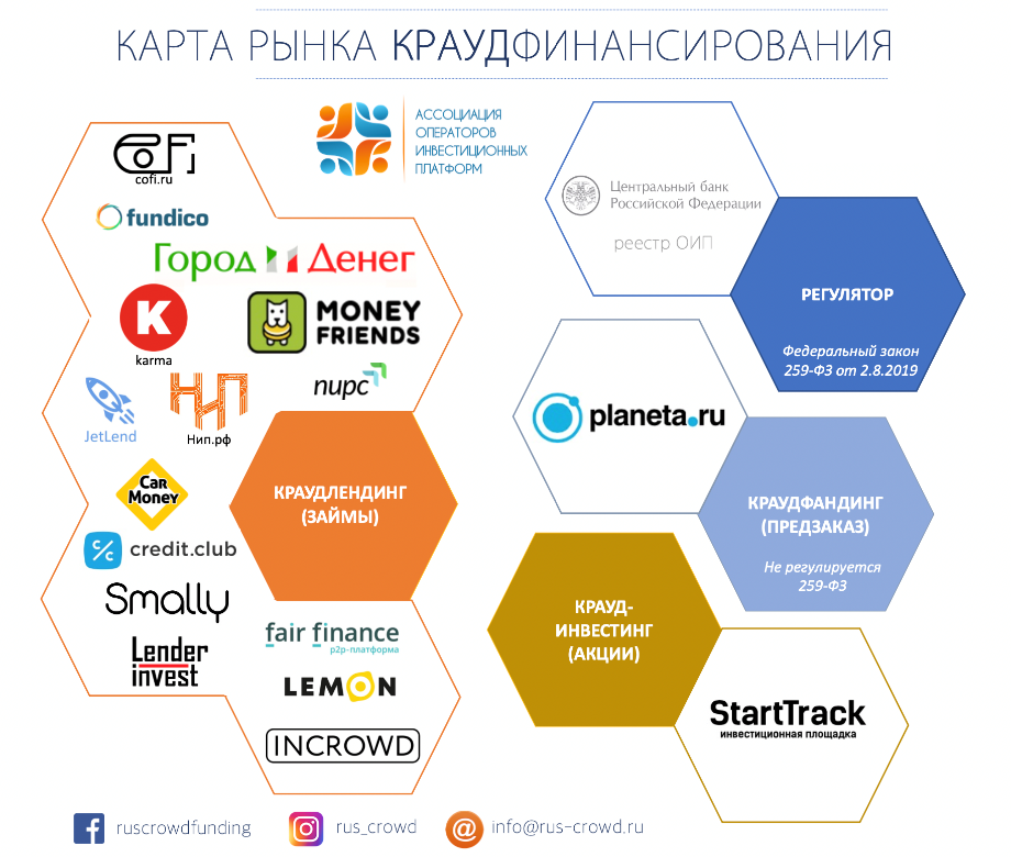 Ассоциация операторов инвестиционных платформ (см.на сайте: rus-crowd.ru) создала карту рынка краудфинансирования, в которой отражены представители краудфандинга, краудлендинга и краудинвестинга: