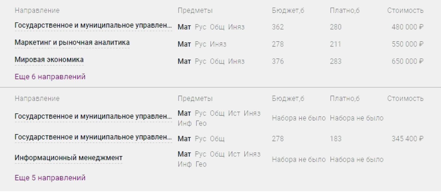 Примеры программ обучения в вузах — стоимость превышает 300 тысяч в годСкриншот: «Навигатор поступления» / Skillbox Media