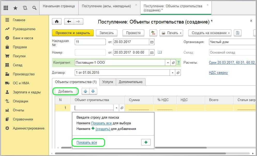 Когда закуплены новые объекты, до модернизации ОС в 1С 8.3 важно оформить их на склад по документу «Поступление». Затем создать новый документ с видом поступления «Объект строительства»