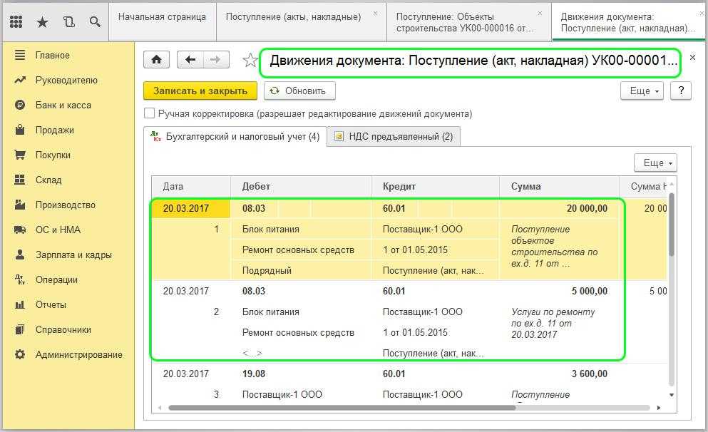 В результате проведения документа программа сформирует следующие бухгалтерские записи: