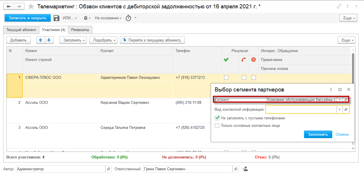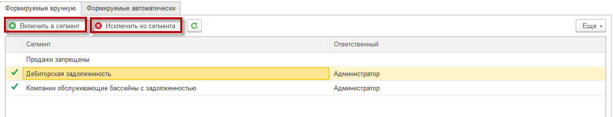 Формируемые вручную. Показан список всех сегментов, которые формируются вручную. Используя команды Включить в сегмент/Исключить из сегмента, можно отметить сегменты, в которые должен быть включен (или из которых исключен) клиент: