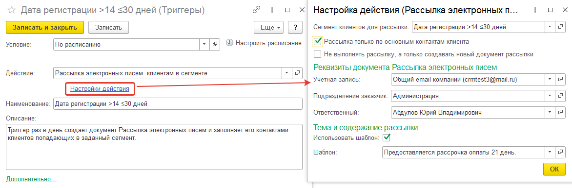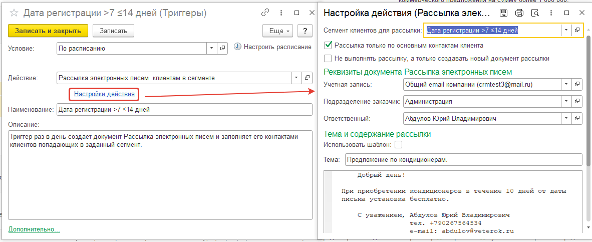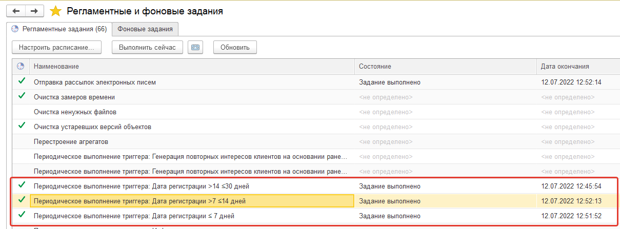 При выполнении регламентного задания согласно настройкам триггера формируется рассылка на клиентов согласно заданному сегменту в триггере.