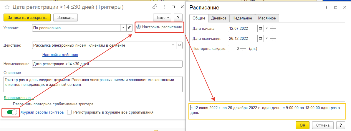 Каждый триггер необходимо включить и задать расписание срабатывания данного типа триггера: