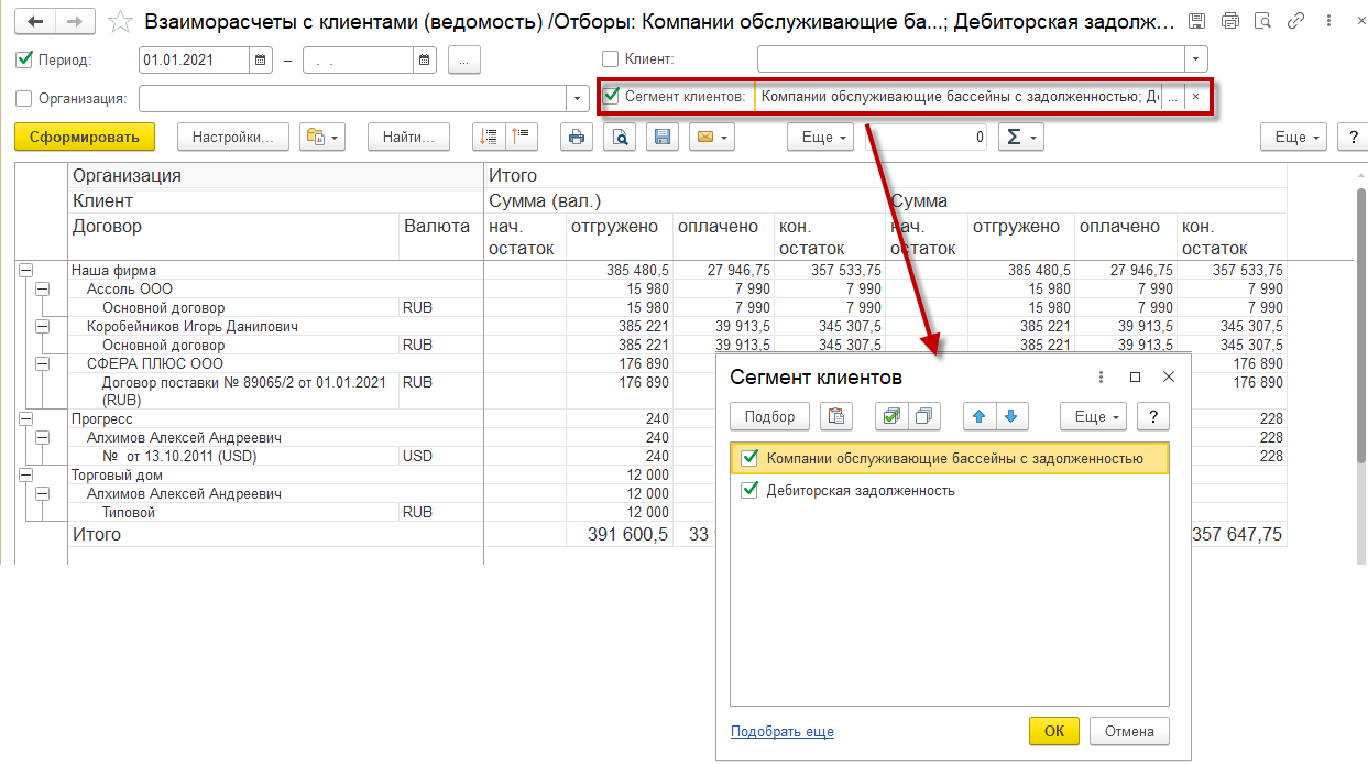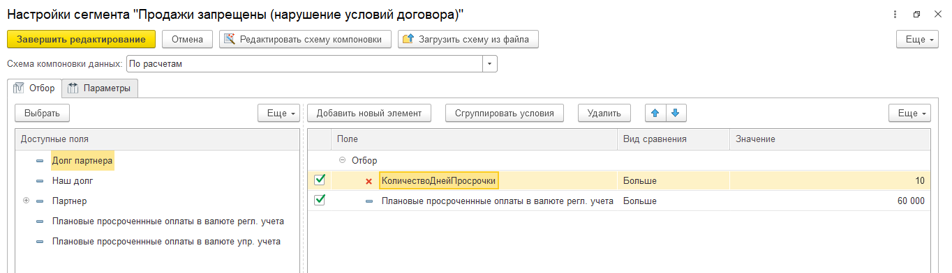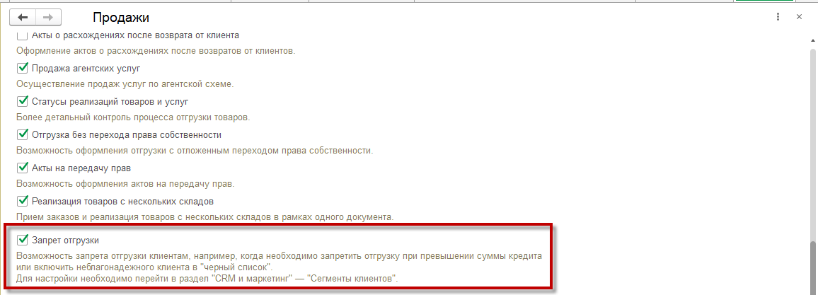 В решениях «1С:Управление торговлей и взаимоотношениями с клиентами (CRM)» и «1С:CRM: Модуль для 1С:ERP и 1С:КА 2» сегменты используются также для запрета отгрузки, например, при превышении суммы кредита.