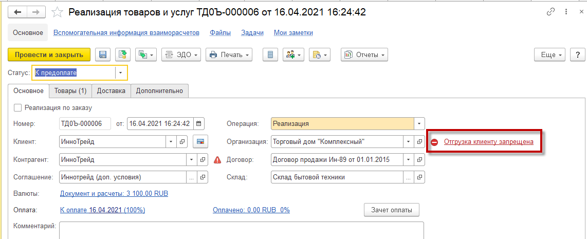 При формировании состава сегмента (динамически, вручную или периодически) в карточке тех клиентов (партнеров), которые попали в данный сегмент, появится гиперссылка Клиенту запрещена отгрузка: