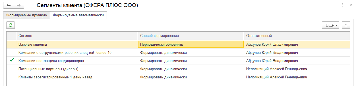 Формируемые автоматически. Показывается список сегментов, данные в которых формируются автоматически в соответствии с заданными правилами (динамические или периодически обновляемые). В списке отмечены сегменты, в которые входит данный клиент: