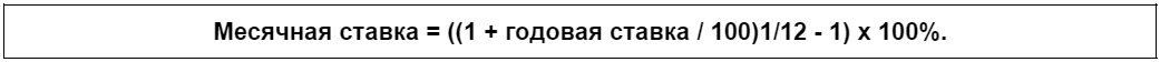 В данном случае месячная ставка равна 0,9489% (((1 + 12/100)1/12 — 1) x 100%).
