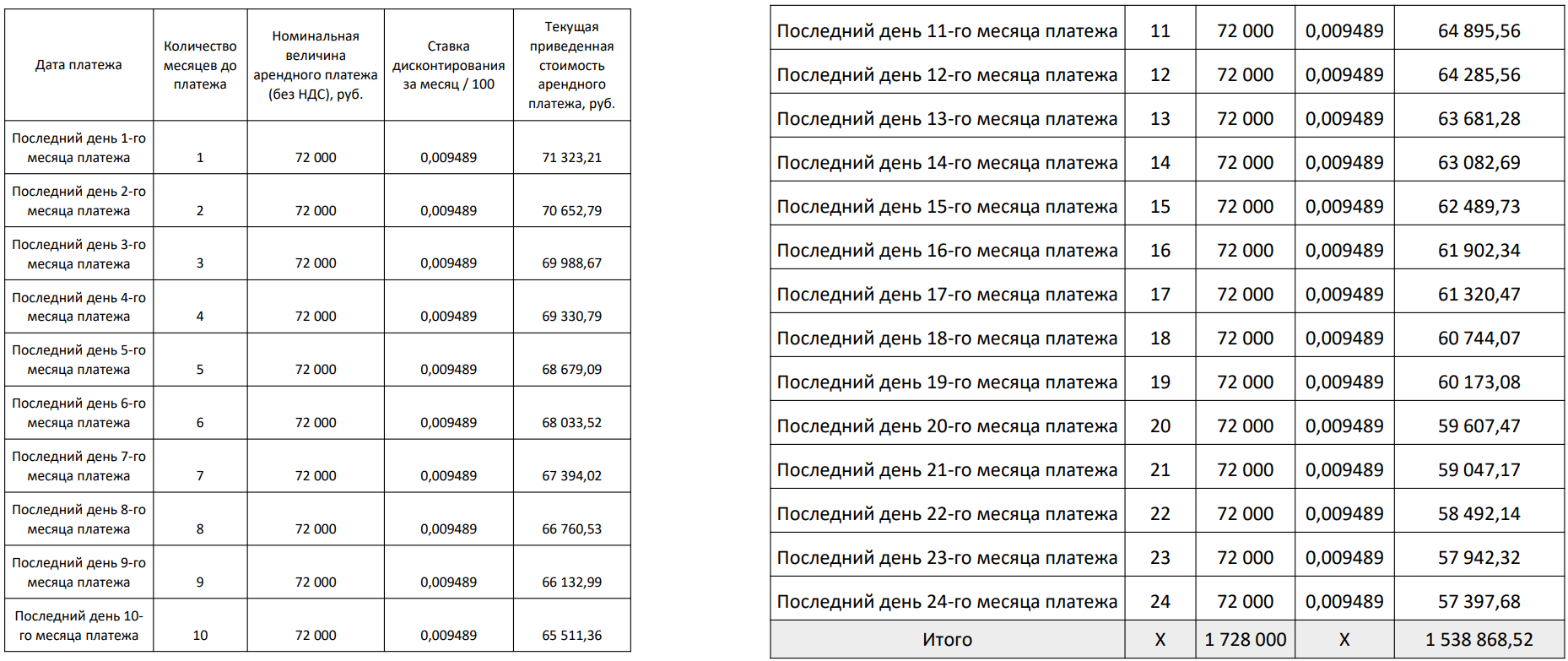В таблице ниже отражена приведенная стоимость каждого арендного платежа, рассчитанная с применением данной формулы. Расчеты произведены с использованием таблицы Excel.