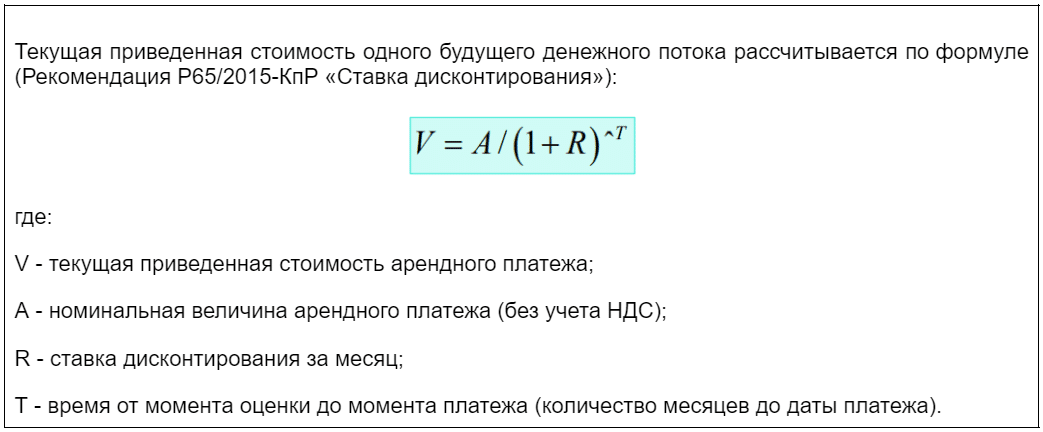 Предположим, что в данном случае организация не может определить ставку дисконтирования расчетным путем. Соответственно, она использует ставку, по которой могла бы получить заем на сопоставимых условиях, —12% годовых. В рассматриваемой ситуации арендные платежи вносятся ежемесячно. Для их дисконтирования месячная ставка определяется по формуле: