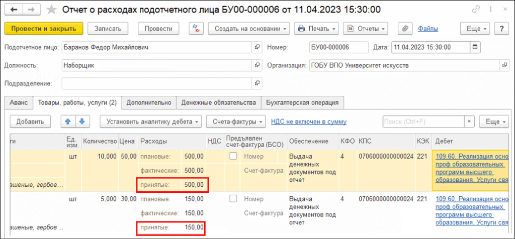 При проведении документа будут сформированы бухгалтерские записи по расходам подотчетного лица: