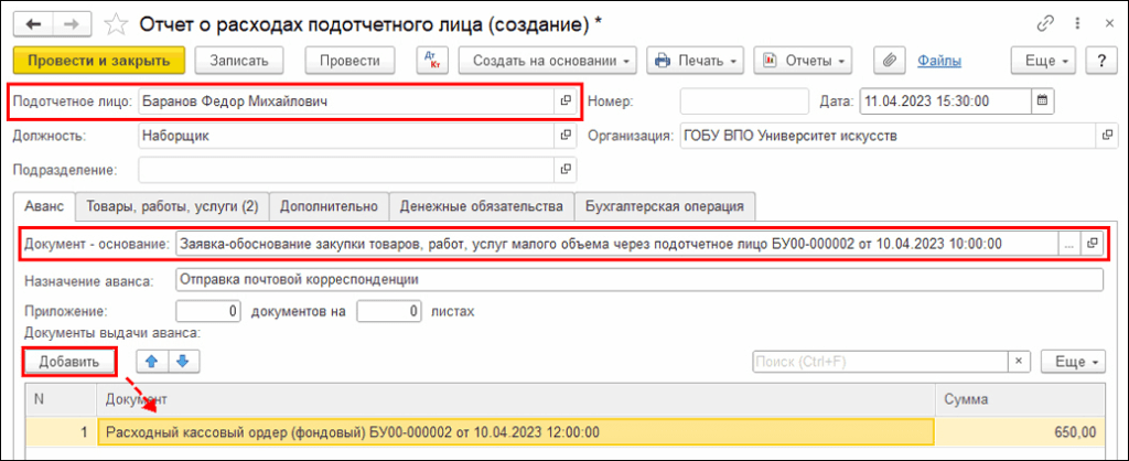 В созданном документе Отчет о расходах подотчетного лица в шапке следует выбрать Подотчетное лицо, предоставившее отчет, и на закладке Аванс указать документ-основание — ранее созданный документ Заявка-обоснование закупки товаров, работ, услуг малого объема через подотчетное лицо.