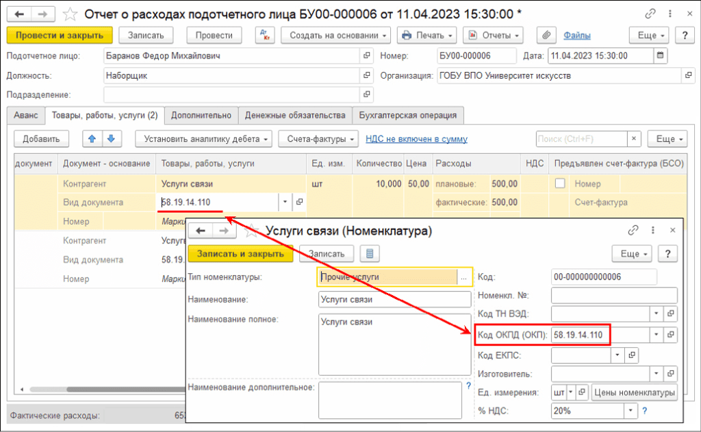 При этом в справочнике Номенклатура по заполненной услуге должен быть заполнен реквизит Код ОКПД, соответствующий коду ОКПД, указанному в документе Заявка-обоснование закупки товаров, работ, услуг малого объема через подотчетное лицо.