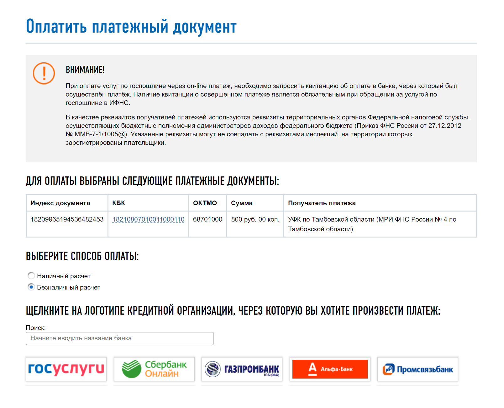 Если вводите ИНН – нажимайте «Оплатить» и выбирайте безналичный способ оплаты. Затем банк и оплату через «Госуслуги». В результате получите вот такую квитанцию. Ее можно распечатать и приложить к документам для регистрации ИП самостоятельно.