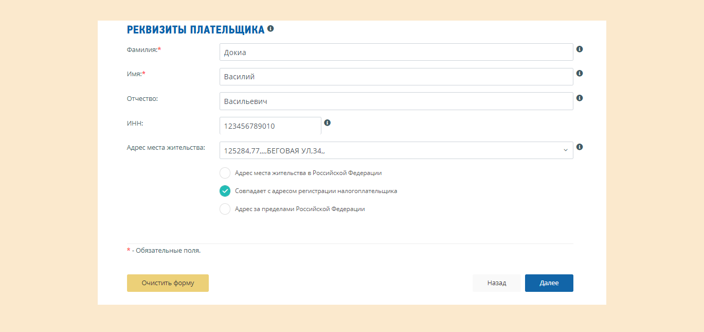 В поле «Реквизиты получателя платежа» необходимо указать адрес регистрации – чтобы сайт смог определить ответственную налоговую.