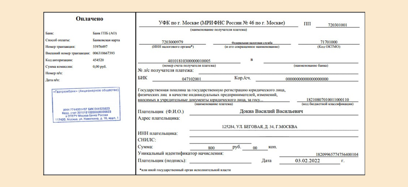 Дальше вам надо будет зайти на сайт налоговой, найти там квитанцию госпошлины и распечатать её, если вы собираетесь подавать документы лично. При регистрации ИП через удалённые сервисы пошлину в 2022 году платить уже не надо. Итак, если вы намереваетесь отдать документы в руки инспектору, вам нужно оплатить 800 рублей. Сделать это можно в любом отделении Сбербанка.