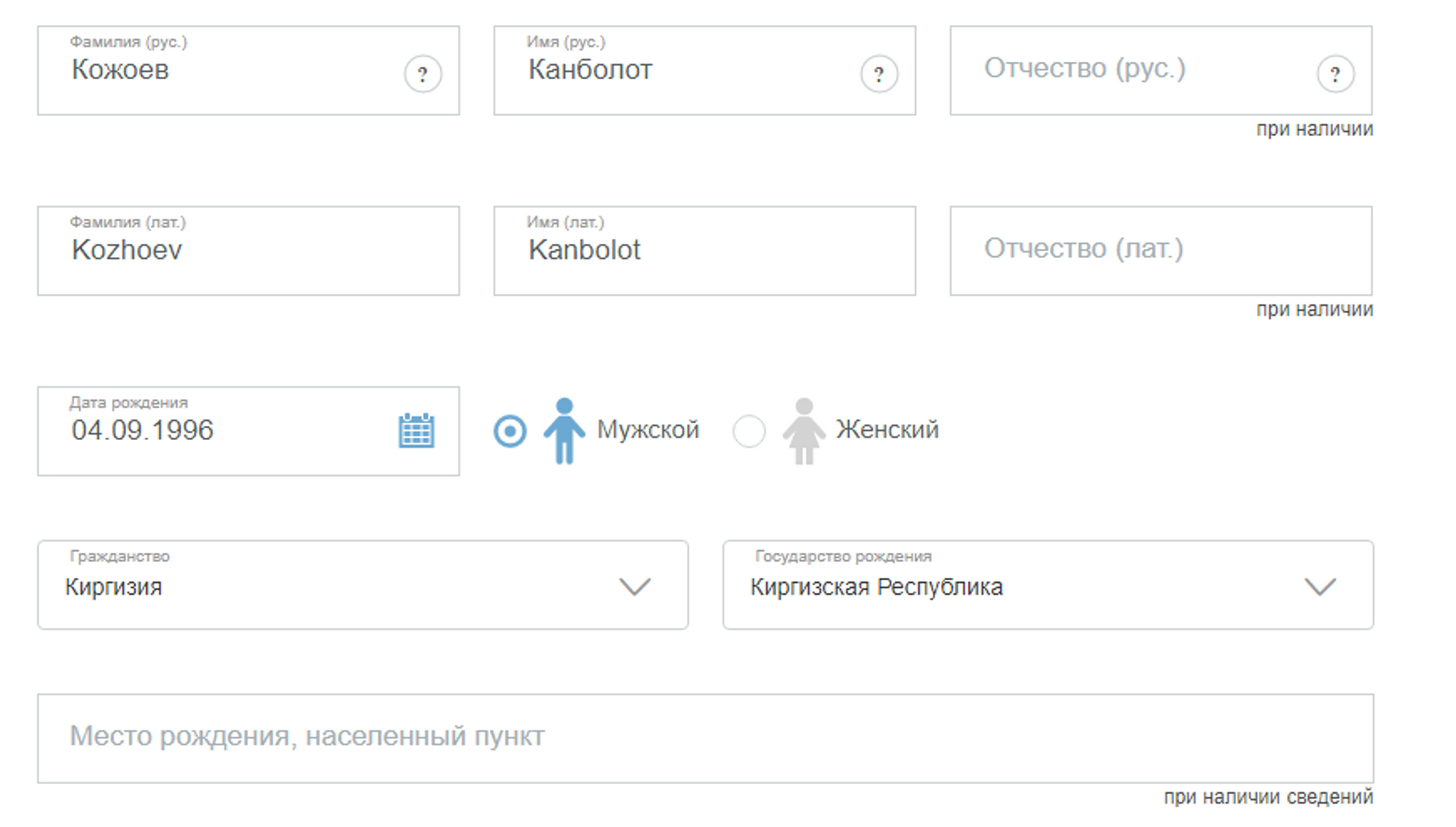 ФИО (рус.) — ФИО на русском языке (отчество указываем при наличии)