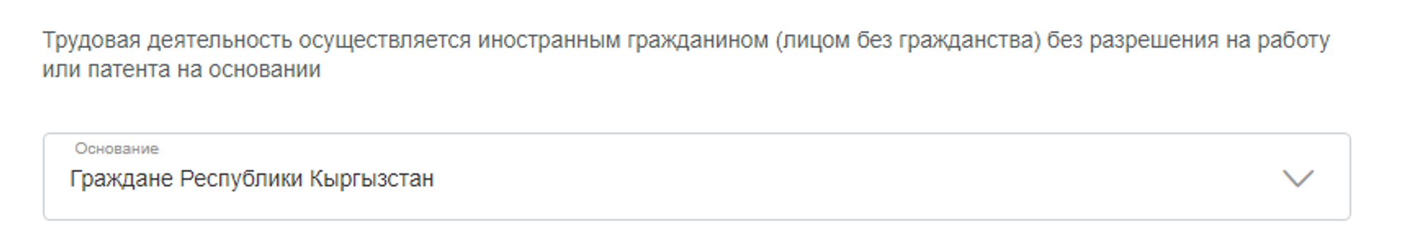 Основание — выбираем нужное гражданство (Граждане Республики Кыргызстан, Беларусь, Армения, Казахстан)