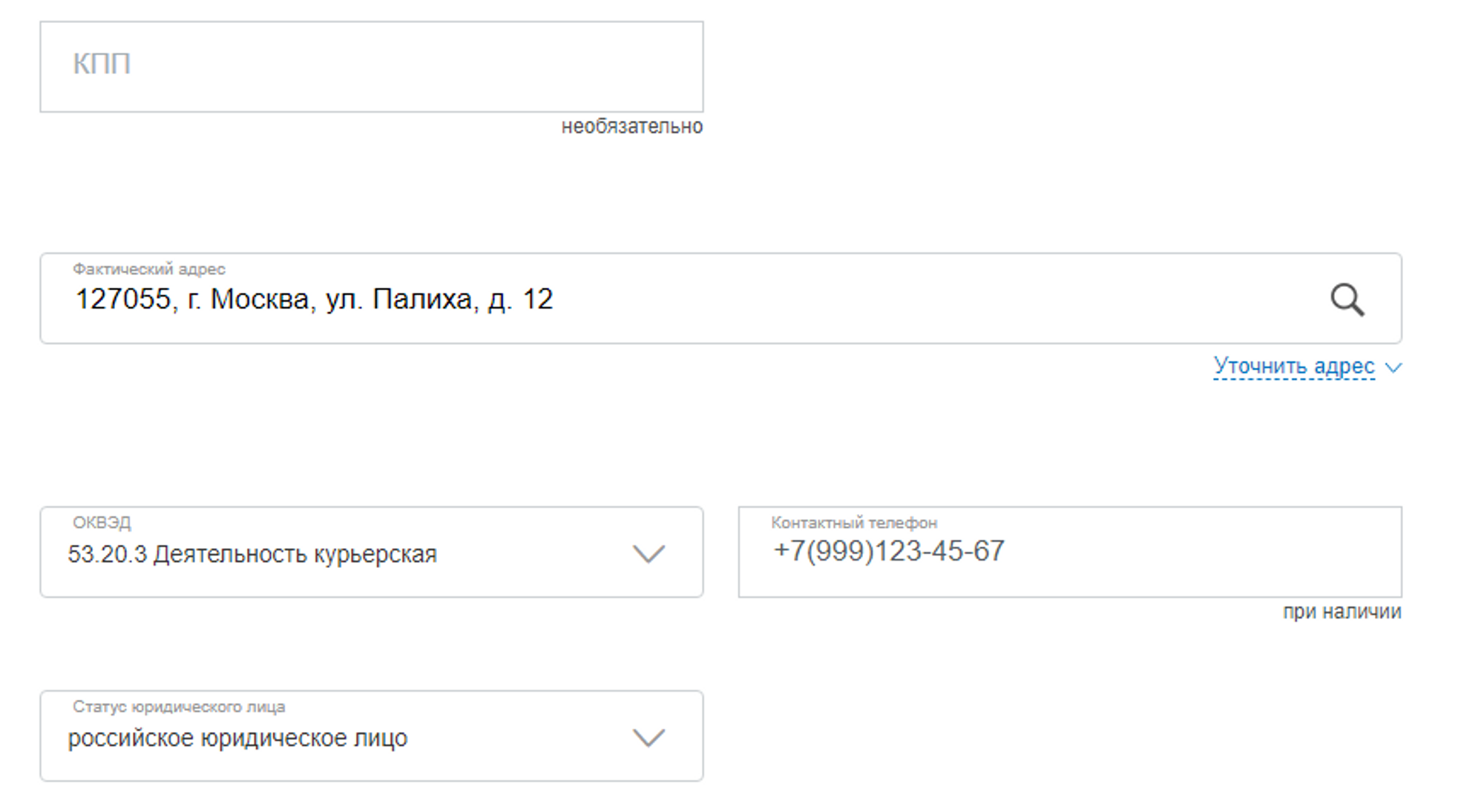 - Фактический адрес — должен быть предзаполнен, если нет, то вводите вручную