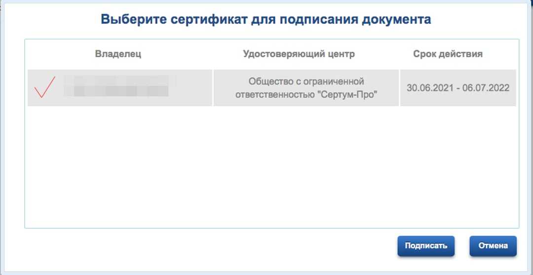 Выберите сертификат. Нажмите кнопку «Подписать»
