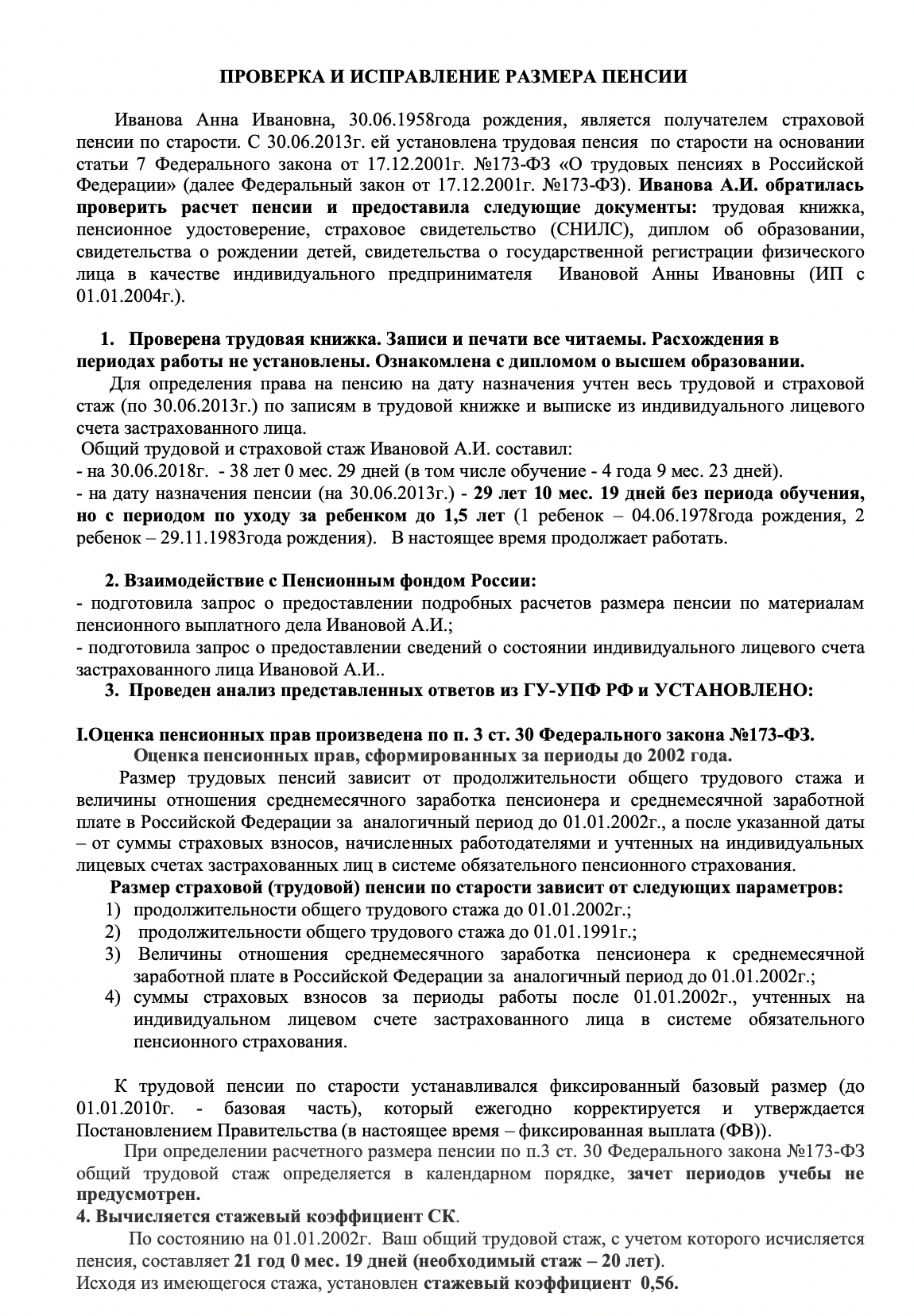 Первая страница примера письменного заключения по проверке размера пенсии.