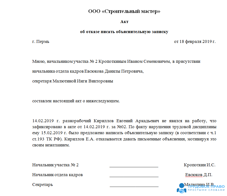 Образец акта отказа в предоставлении письменных объяснений