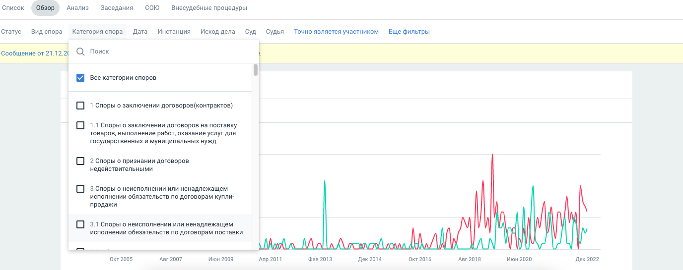 Посмотрите, участвует ли организация в интересующей вас категории спора. Просто выберите нужную категорию и система покажет наглядную статистику.