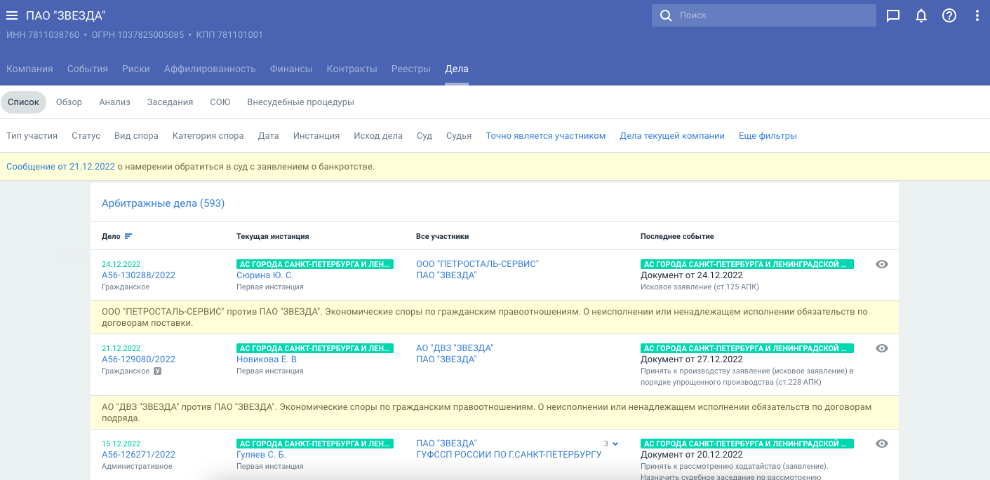 Данные о процессах, в которых участвует компания, а также готовый анализ и статистика по спорам находятся в ее карточке во вкладке «Дела». Вкладка содержит ключевые сведения об арбитражных спорах и делах судов общей юрисдикции: стороны по делу, номер дела, процессуальные события и судебные инстанции.
