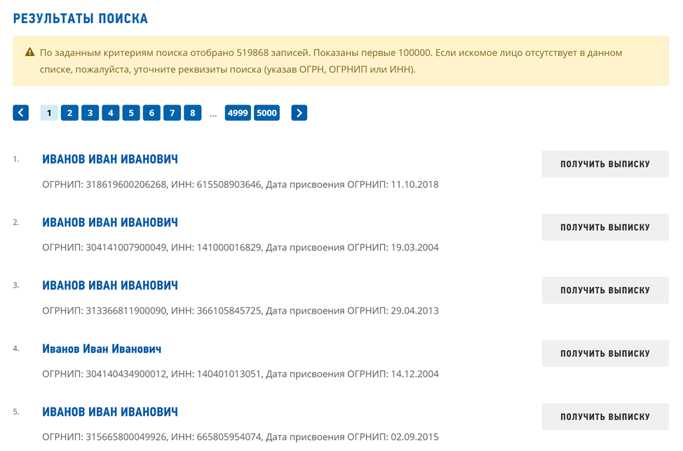Далее система найдет, подходящих под запрос, лиц. Стоит учитывать не только дату регистрации той или иной организации, но и дату прекращения деятельности, если таковая имеется.
