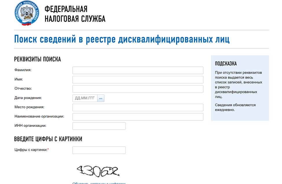 Для начала поиска введите Ф.И.О. запрашиваемого лица, его дату и место рождения, а также название и ИНН организации. Чтобы система удостоверилась, что вы не робот, введите символы (цифры) в специальное поле и нажмите кнопку «Найти».