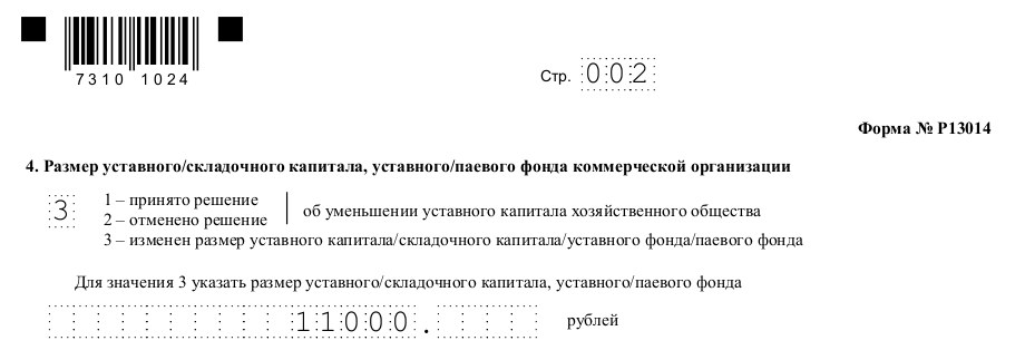 На второй странице титульного листа заполняем пункт 4: ставим цифру 3: мы меняем размер уставного капитала и ниже заполняем поля с его размером. Не существует минимального вклада для нового участника, поэтому можно внести 1000 рублей.