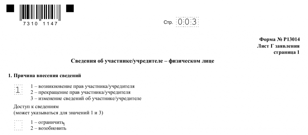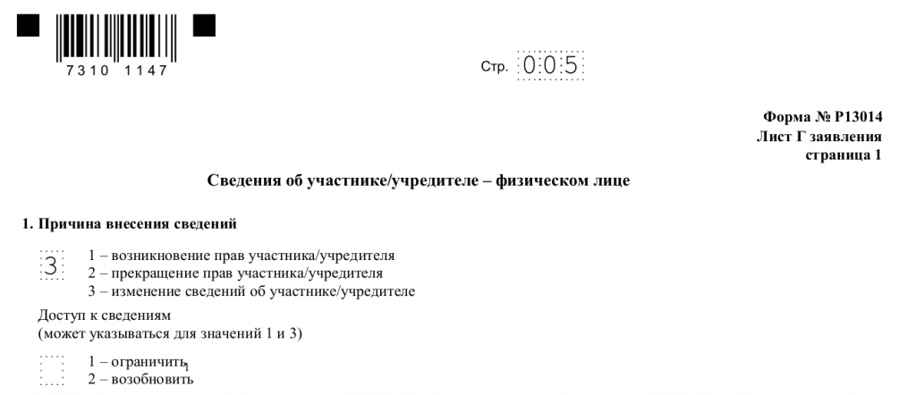 Еще раз заполняем лист Г — это будут страницы 005, 006. В первом пункте ставим — 3, заполняем пункты 2, 3 — указываем также как и для нового участника ФИО, ИНН, дату и место рождения, паспортные данные. В пункте 4 указываем изменившийся размер доли в связи с увеличением уставного капитала. Номинальная стоимость — 10000 рублей, долю указываем в простой дроби 10/11.
