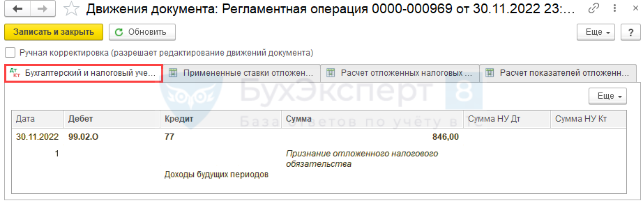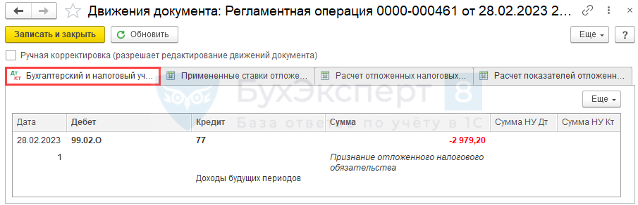 Так как все отложенные доходы сторнированы, регламентная операция Расчет отложенного налога по ПБУ 18 (Операции – Закрытие месяца) погасила ОНО по обязательству Доходы будущих периодов.