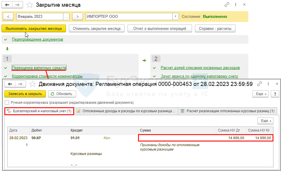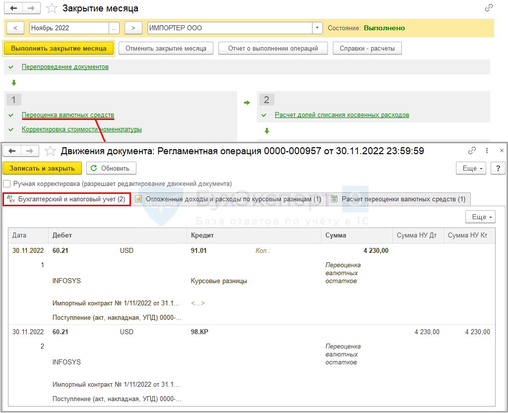 Если на конец месяца есть остатки на счетах расчетов в у. е. или иностранной валюте, а также денежные средства на валютных счетах, то при Закрытии месяца рассчитываются курсовые разницы.