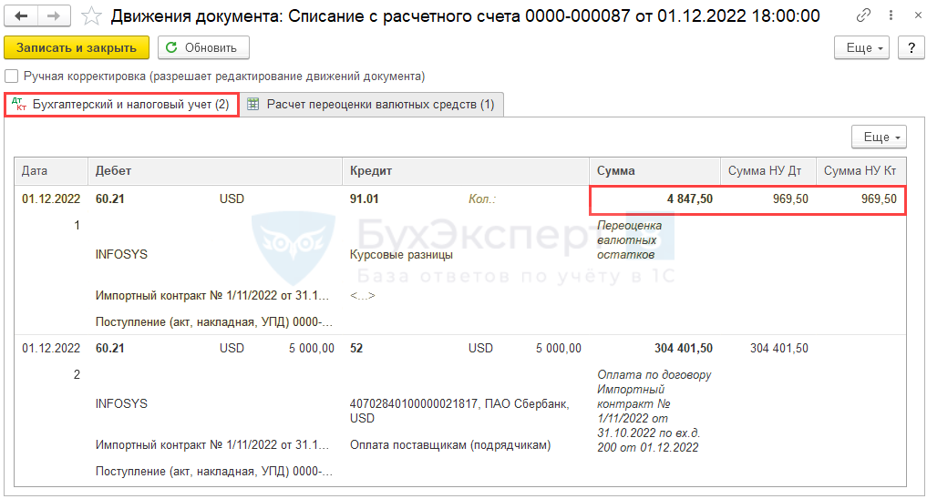 Поскольку алгоритм расчета курсовых разниц существенно изменился, в некоторых случаях вместо одной проводки по переоценке может сформироваться две. Например, результатом переоценки в бухгалтерском учете будет положительная курсовая разница, а в налоговом учете – отрицательная курсовая разница.
