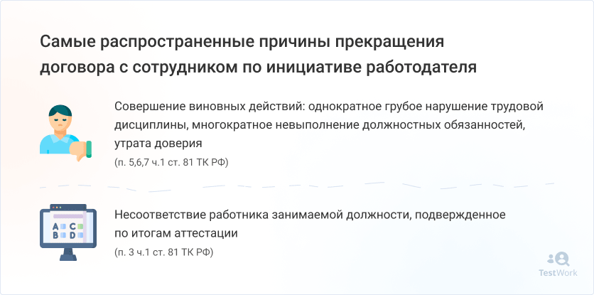 У работодателя, согласно ст. 81 ТК РФ имеется право на инициативу по прекращению трудового договора. Мотивации (основания) к этому бывают общими и дополнительными. Общие применяют ко всем договорам, дополнительные же, только к договорам отдельных категорий сотрудников. Расторжение контракта может произойти в следующих обстоятельствах: