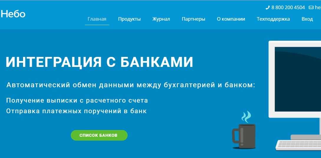 Облачная бухгалтерская система Небо способна автоматически обмениваться платёжными поручениями и выписками с рядом банков с передачей данных по безопасным зашифрованным каналам.