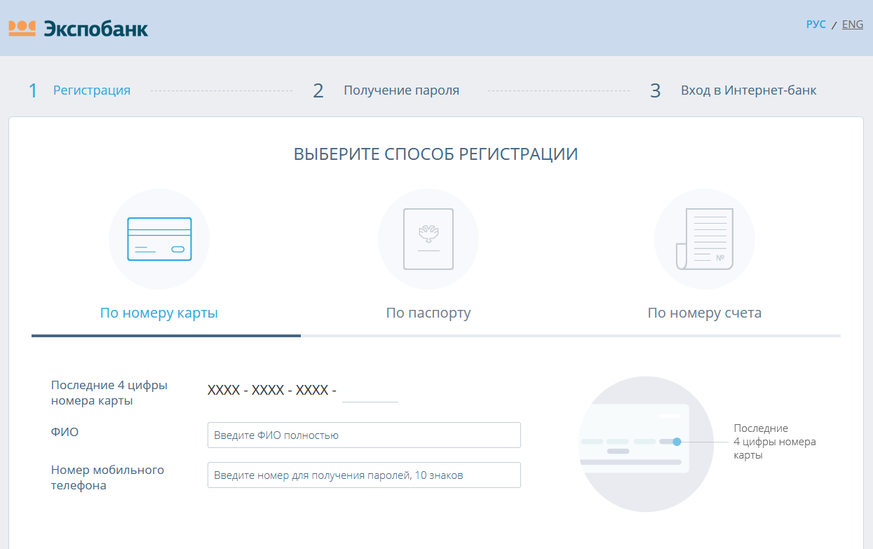 Регистрация учетной записи для клиентов, обладающих банковским продуктом, осуществляется онлайн. На странице входа в личный кабинет https://elf.faktura.ru/elf/app/ кликнуть по активной строке «Зарегистрироваться» и указать удобной способ регистрации: с использованием банковского продукта (пластиковая карта или счет) или по паспорту. Заполнить информацию о клиенте и кликнуть «Далее». Персональный идентификатор (логин) и пароль система отправит с смс на номер, указанный при регистрации.