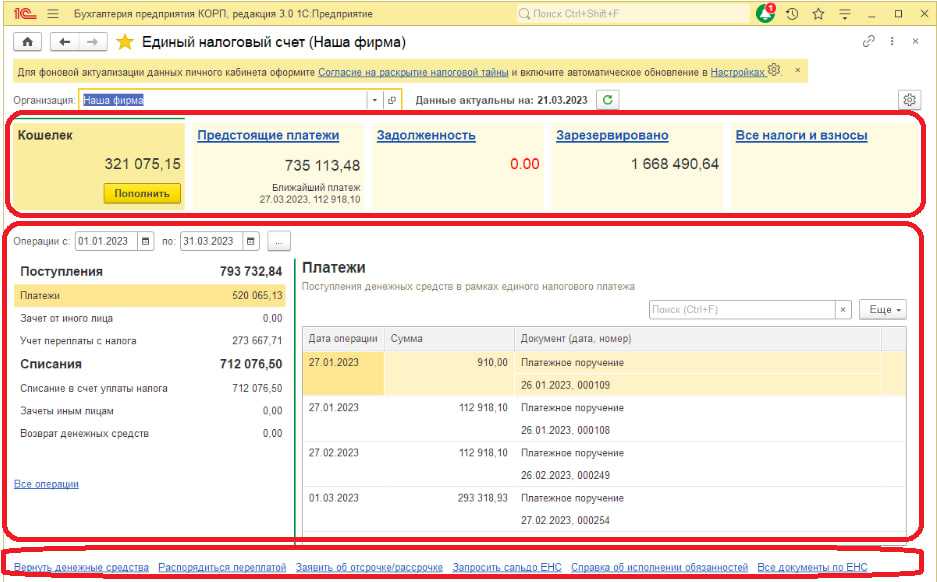 - отслеживать все операции, которые прошли по ЕНС: что и когда списано, что начислено;