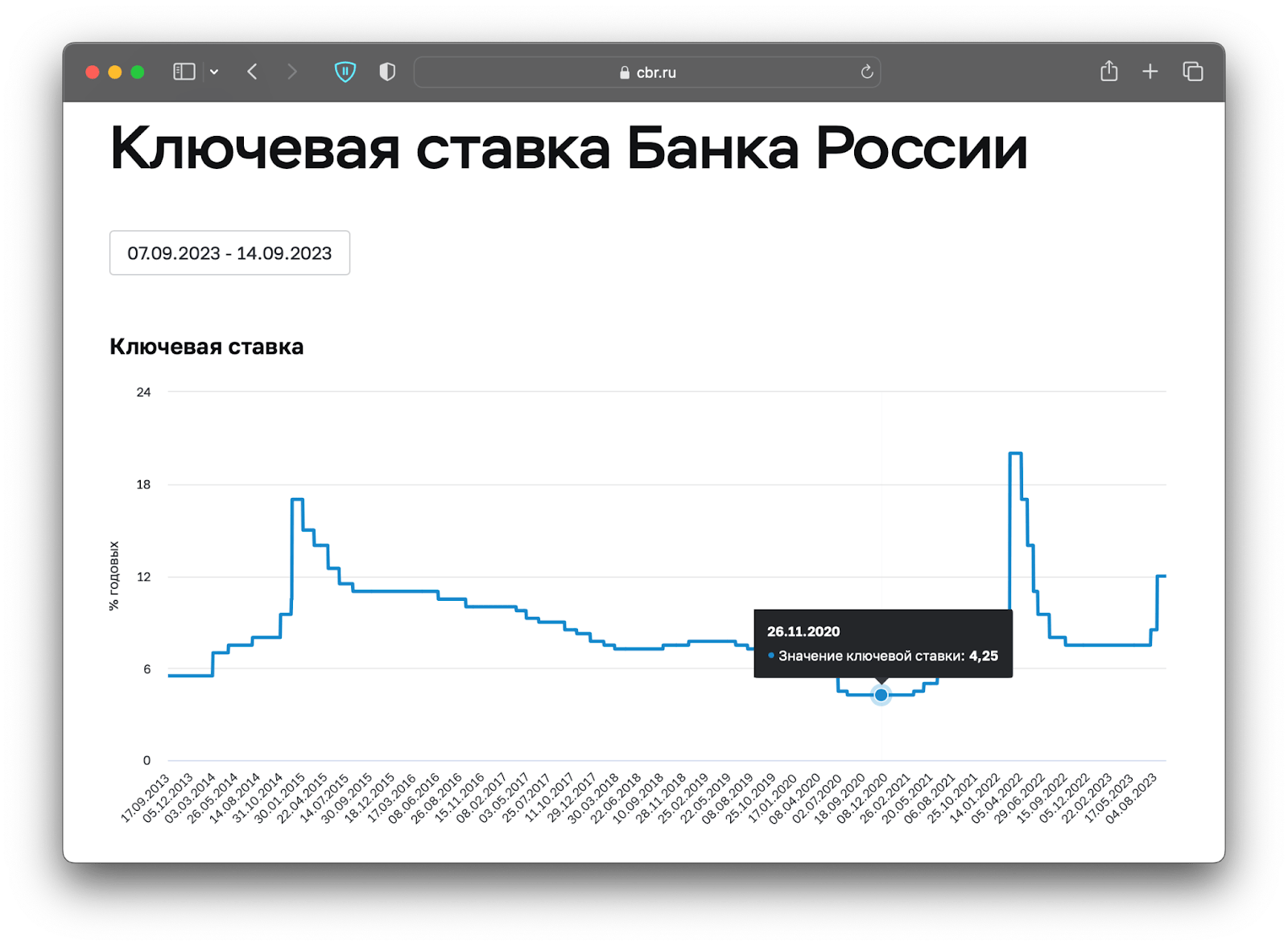 Банк России использует ключевую ставку как инструмент денежно-кредитной политики с 2013 года. За это время самая маленькая ставка была 4,25%, а самая высокая — 20%
