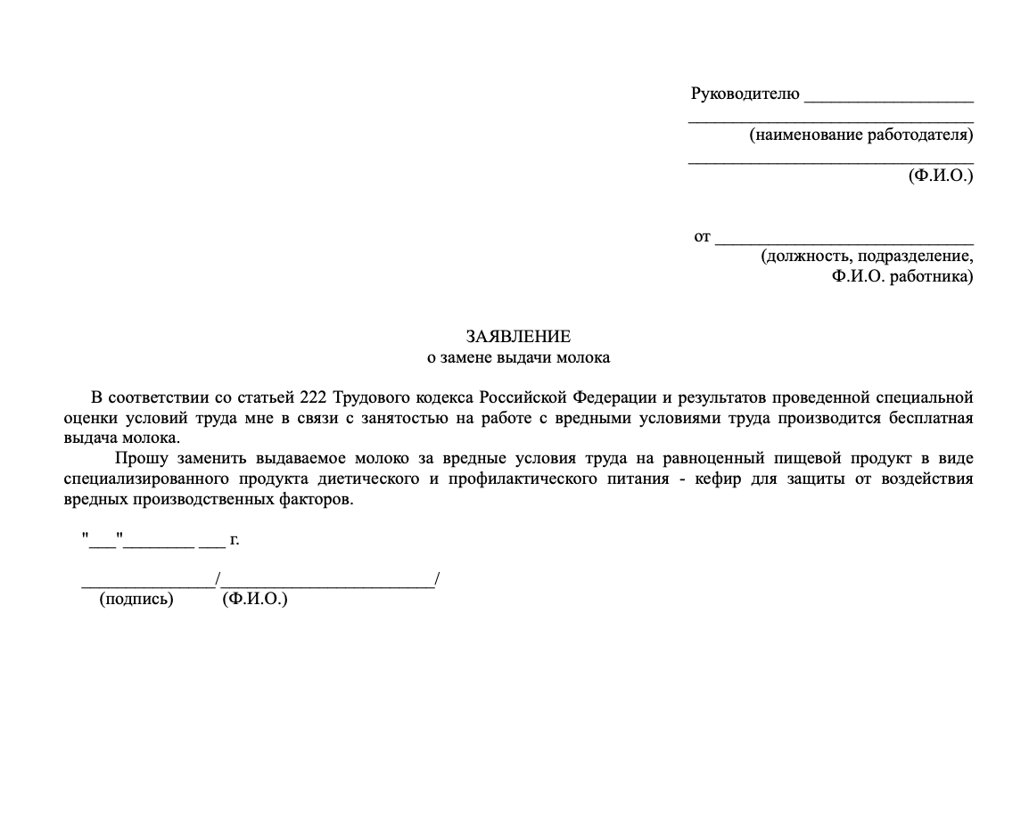 - При отсутствии условий для организации выдачи пищевых продуктов их можно заменить компенсационной выплатой в размере, эквивалентном стоимости молока или других равноценных пищевых продуктов. Для этого работники должны написать письменные заявления.