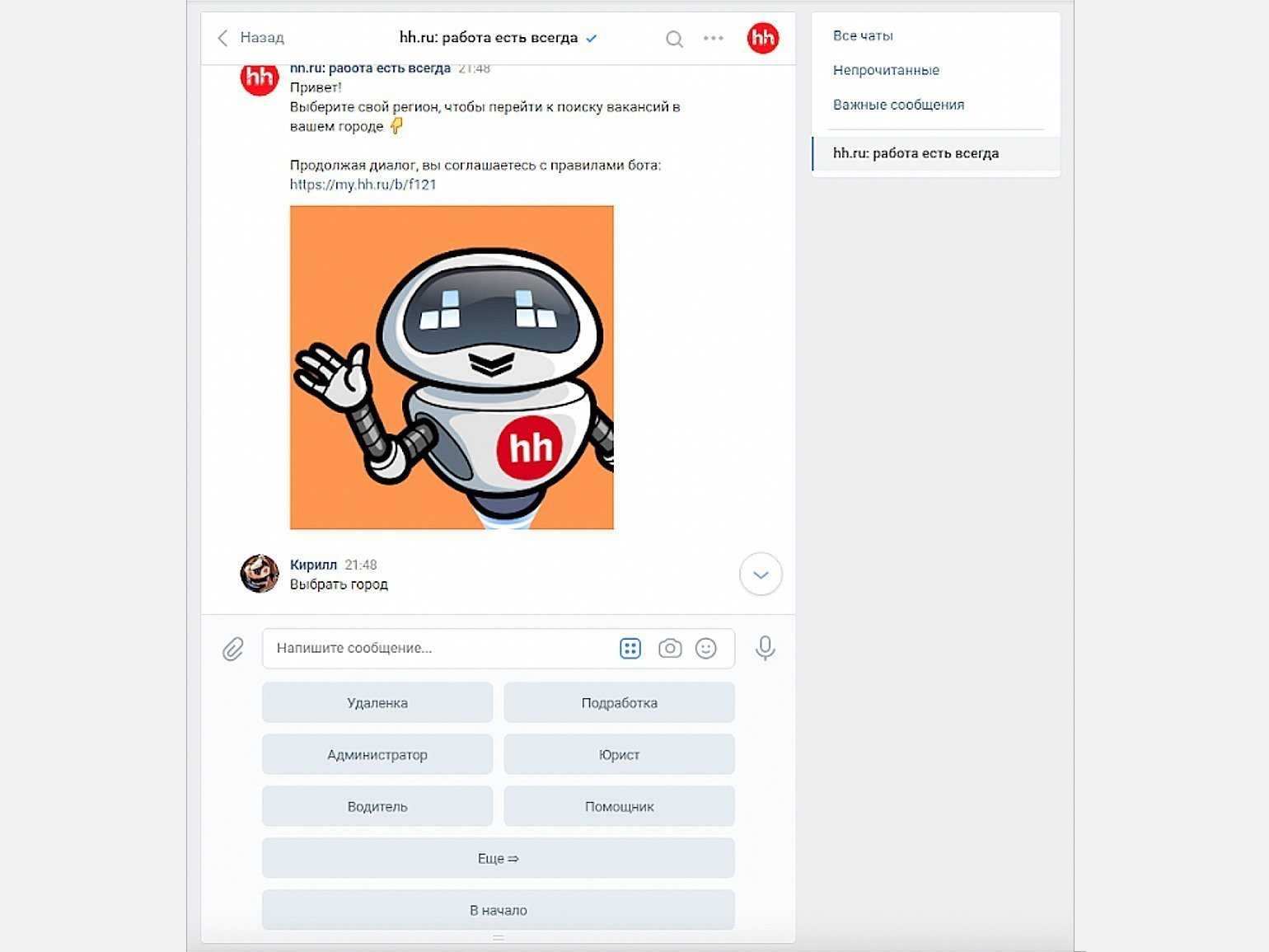 Чат-бот во «ВКонтакте» от компании HeadHunter. Скриншот: официальная страница HeadHunter во «ВКонтакте»