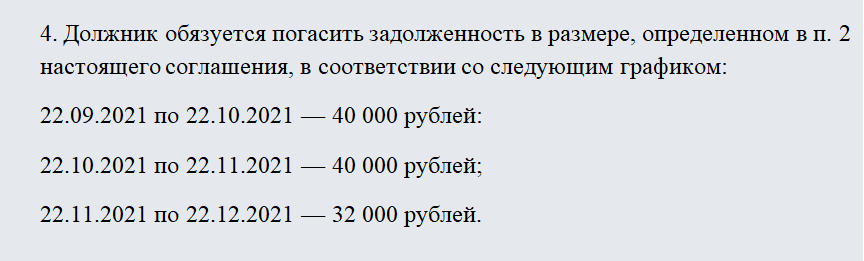 - Должник обязуется погасить задолженность в размере, определенном в п. 2 настоящего соглашения, в соответствии со следующим графиком: