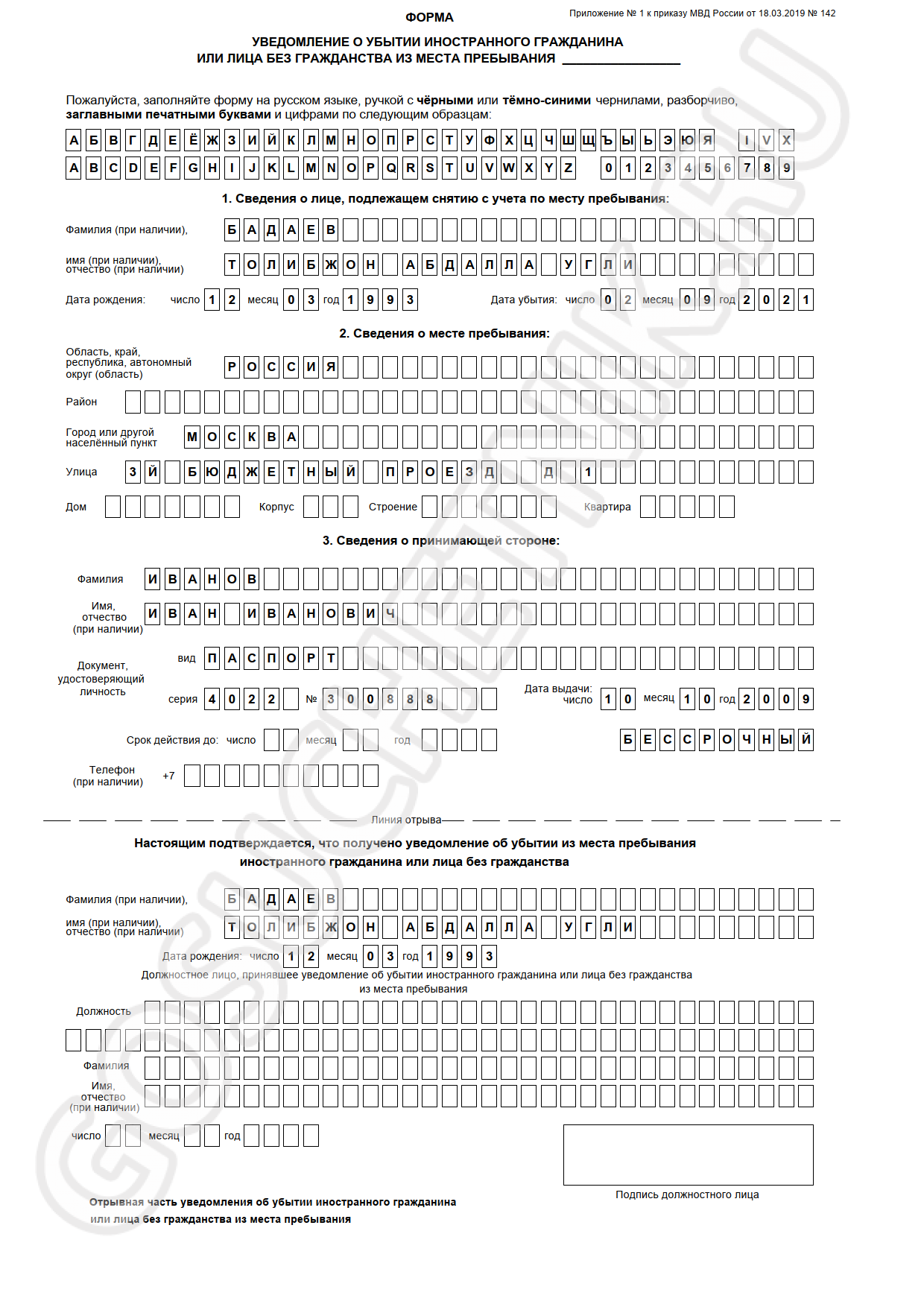 При убытии иностранного гражданина с территории принимающей стороны об этом уведомляют похожей формой, утвержденной приказом МВД № 142 от 18.03.2019.