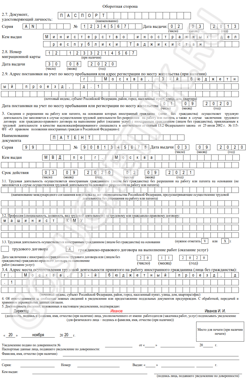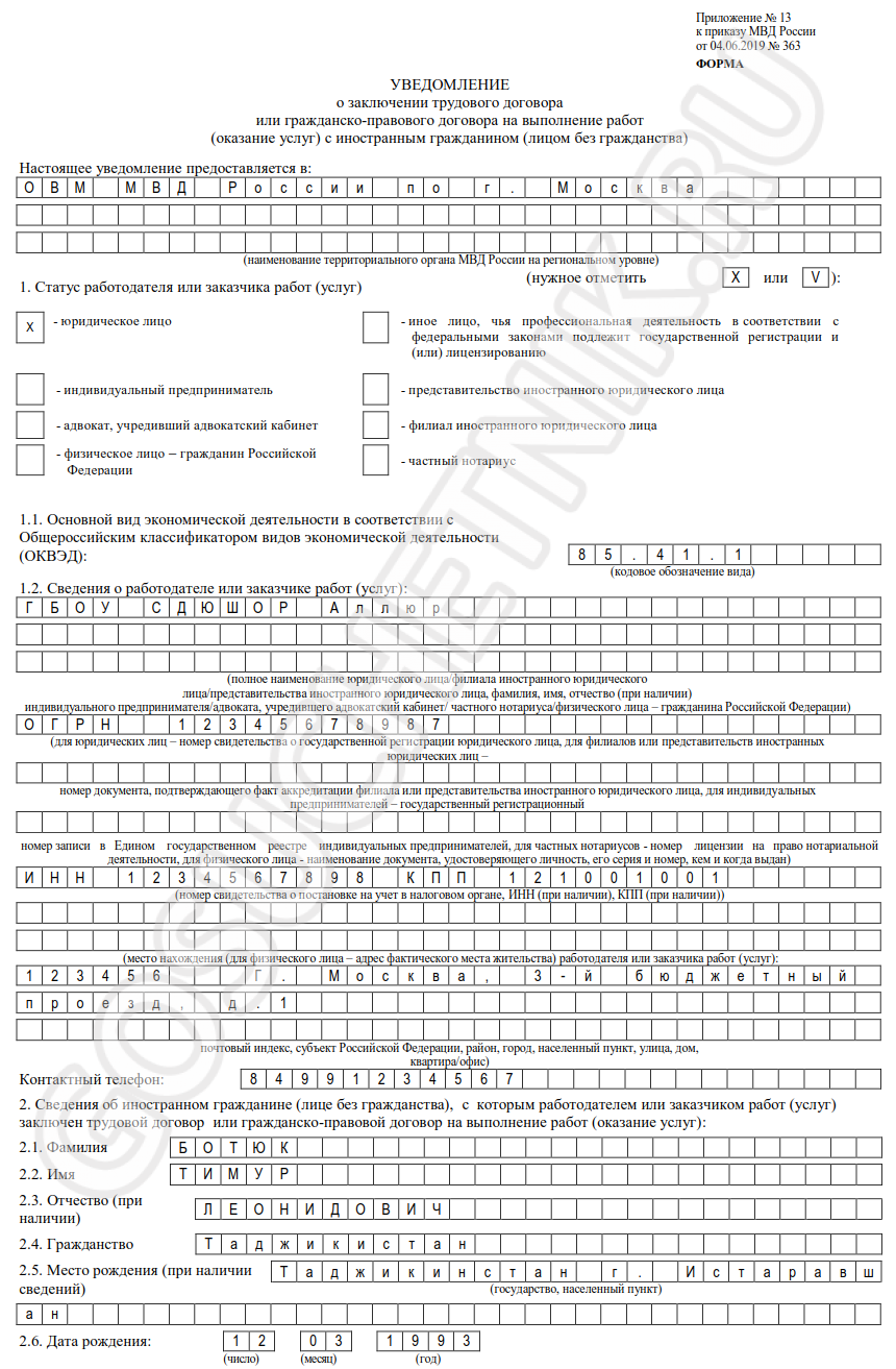 Для наглядности — пример заполненного уведомления, предметом которого является договор ГПХ с гражданином Таджикистана, заключенный юридическим лицом.
